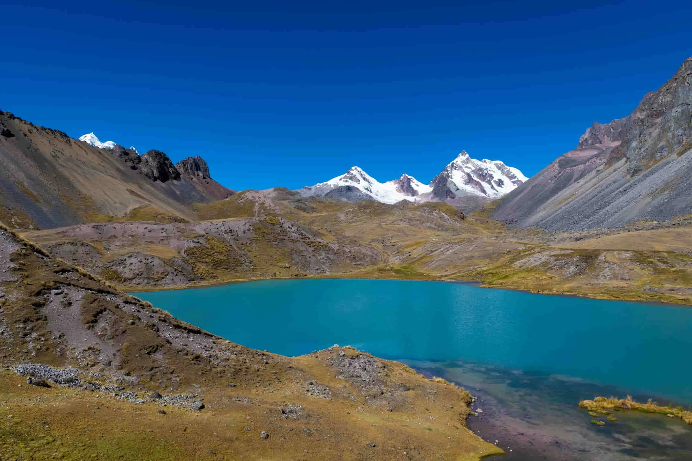 The trail winds across Andean pastures and sparkling glacial lakes, passes two high passes above 5000 meters, then drops into valleys where traders still chew coca leaves and share simple stews. Nights under canvas bring cold air and bright stars. At some point you wonder if the next pass will end up being the toughest. Suddenly you crest and see white peaks on one side red stripes on the other.