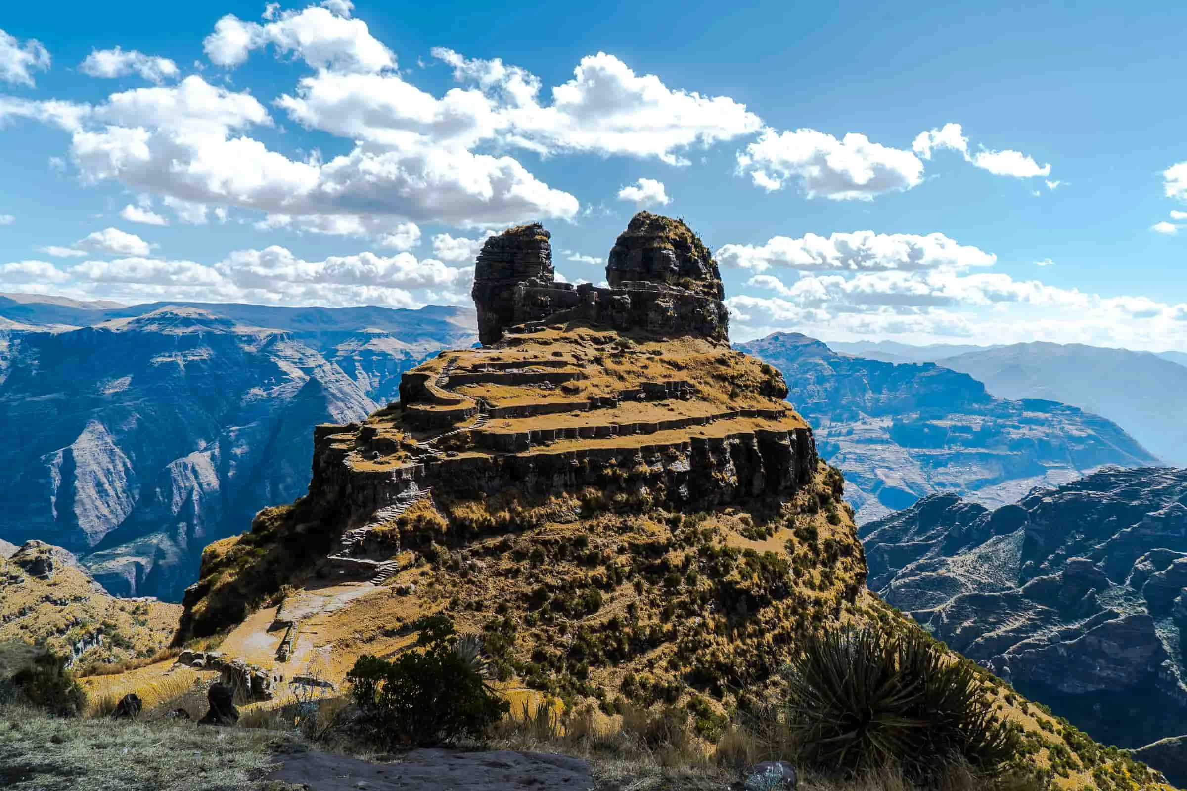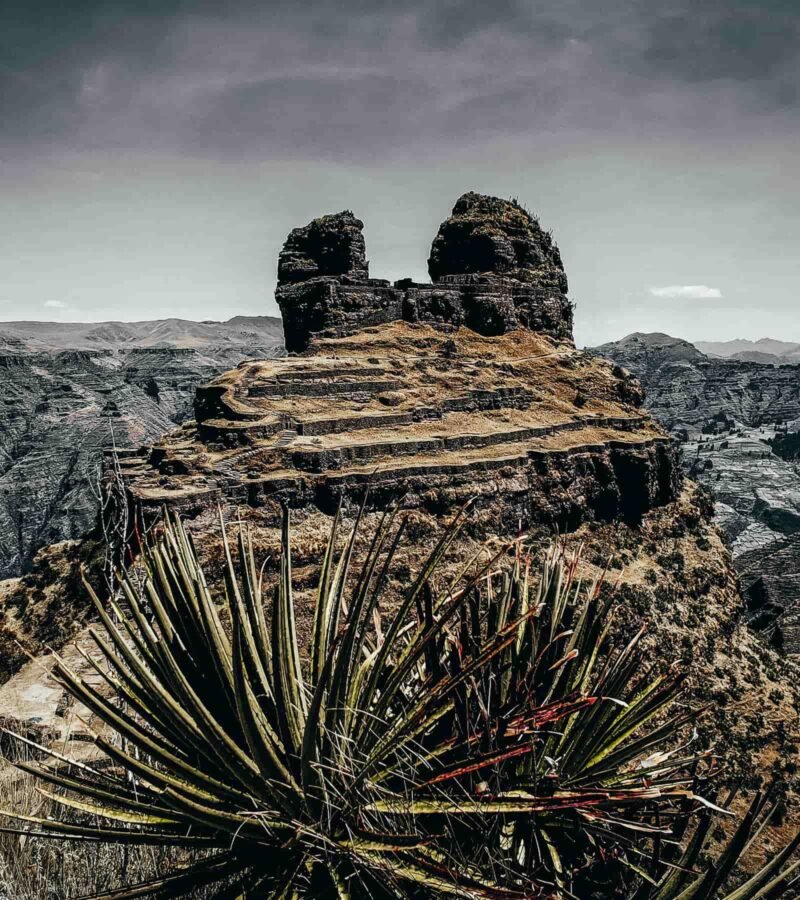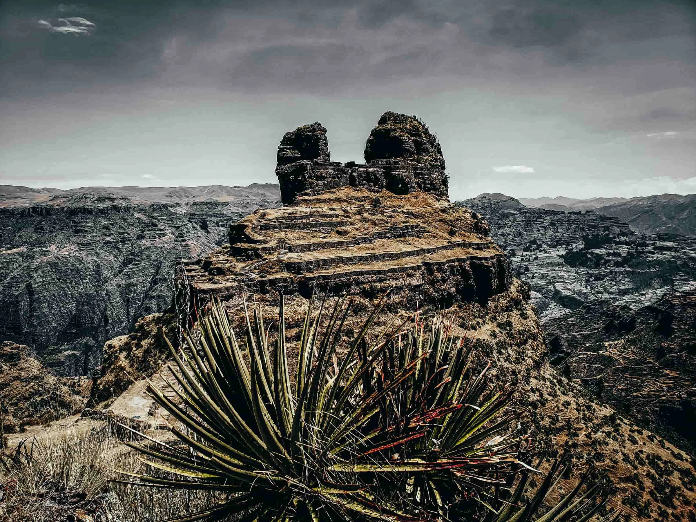 Those horn shaped rock formations mark a pre Inca site later used by Incas as a fortress overlooking Apurimac Canyon. Built around 500 AD with terraces walls and chambers for defense or rituals. Not huge like Machu Picchu but impressive in isolation locals call it the horn fortress cuz the peaks look like that.