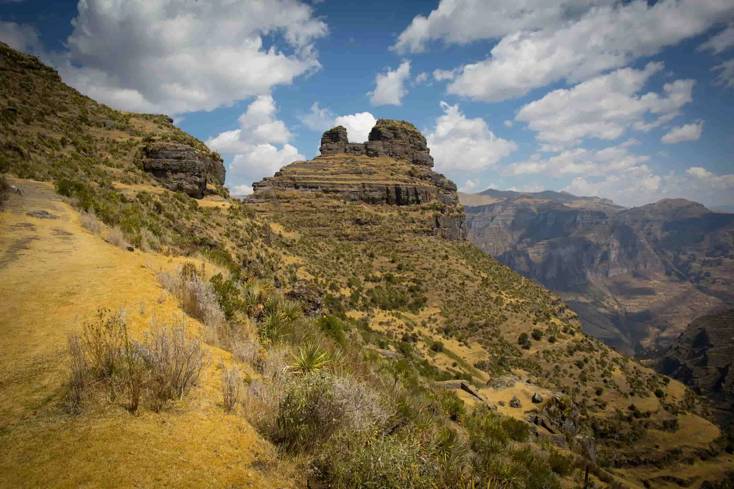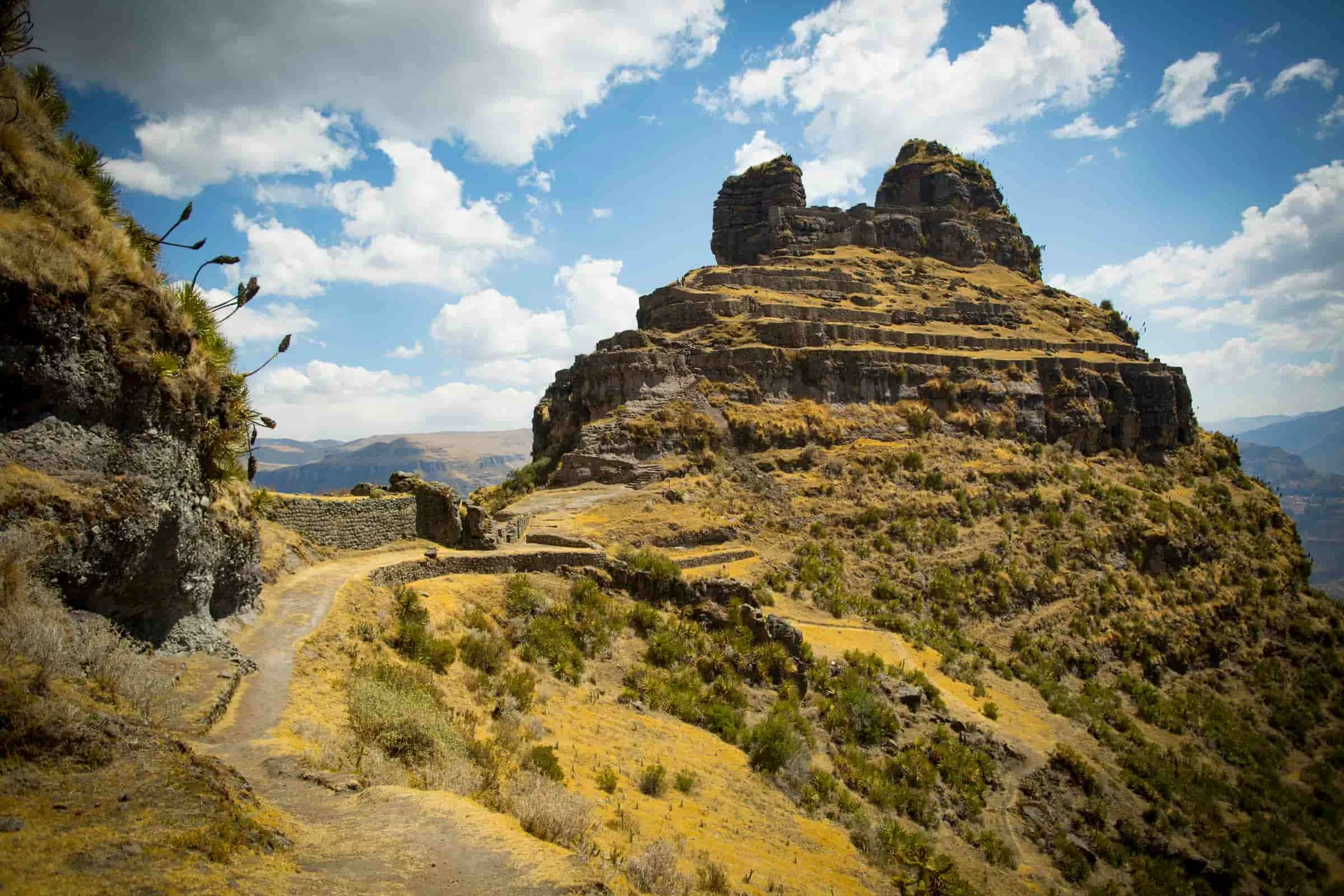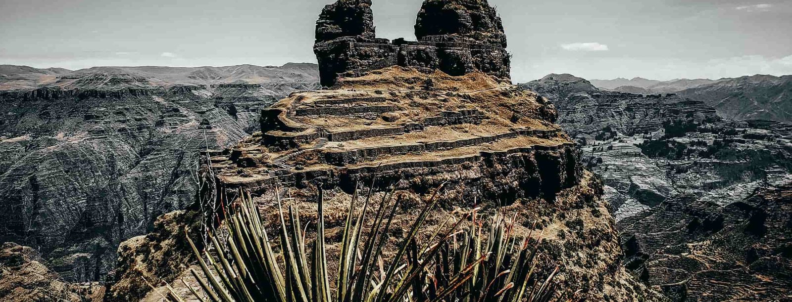 Those horn shaped rock formations mark a pre Inca site later used by Incas as a fortress overlooking Apurimac Canyon. Built around 500 AD with terraces walls and chambers for defense or rituals. Not huge like Machu Picchu but impressive in isolation locals call it the horn fortress cuz the peaks look like that.